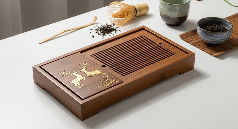 Experience the perfect balance of tradition and modern design with our handcrafted Eco-Friendly Bamboo Artistry. Made from premium bamboo, this elegant tray features a refined dark wood finish with a precision-carved drainage grid, accented by a graceful deer motif symbolizing harmony and longevity.